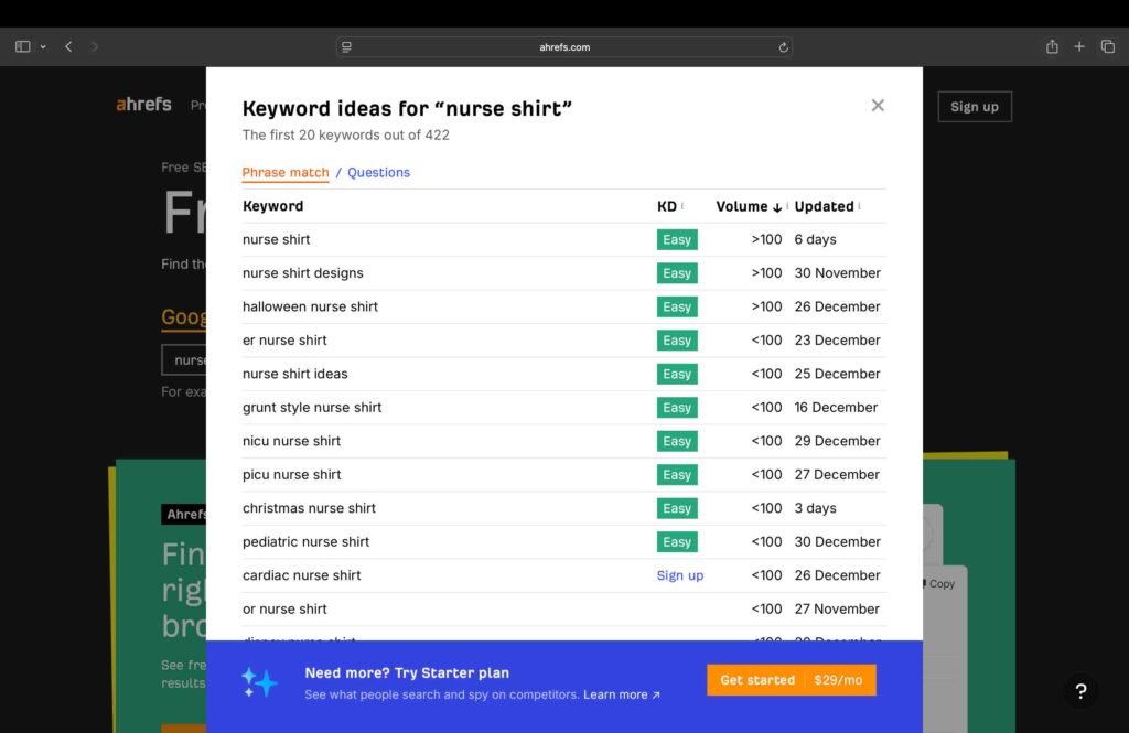 The unique aspect of this tool is that it can be quite useful for physical product research because its “phrase matches” typically indicate various niche ideas for physical products. For instance, in the screenshot below, you can see the “phrase match” keywords indicated various niches for the “nurse shirt,” such as “er nurse shirt,” “christmas nurse shirt,” and “pediatric nurse shirt.”