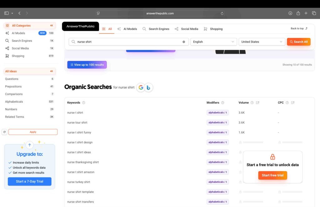 In the screenshot below, you can see that the tool provided various organic searches for the keyword “nurse shirt.”