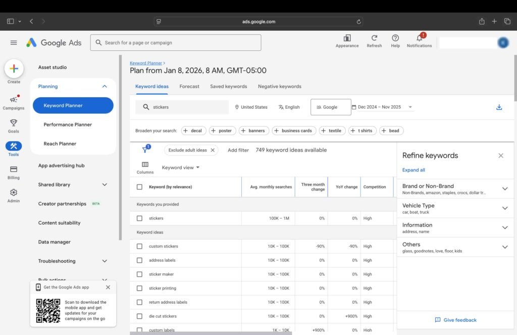 In the screenshot below, you can see that the tool generated 700+ keyword ideas for the search term “stickers” and various filters to refine the search results.