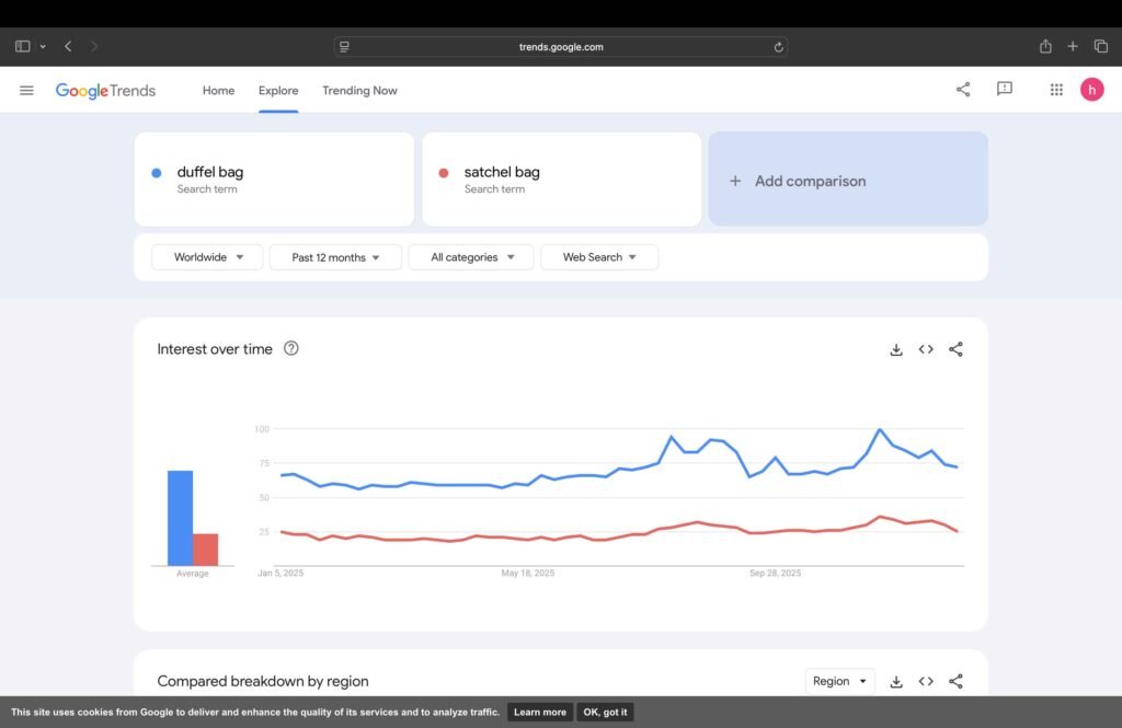 The Google Trends tool helps analyze the popularity of a specific keyword worldwide or at a specific country level for a specified time range. Furthermore, you can also compare multiple keywords to identify their relative popularity. Additionally, the tool offers related search phrases for these keywords along with regional analysis. Since it displays trends, it can be quite useful to analyze the seasonal demand of products.