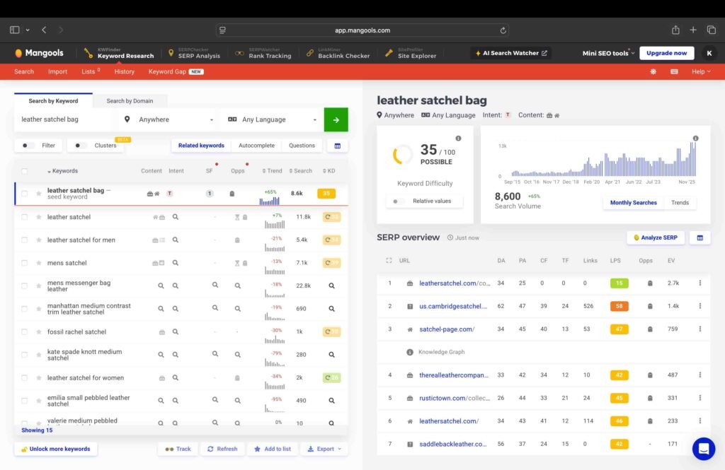 Mangools offers a limited free plan. You can use its KWFinder tool to find keyword ideas for further research. It also shows monthly search trends and top-ranking pages for a specific keyword.