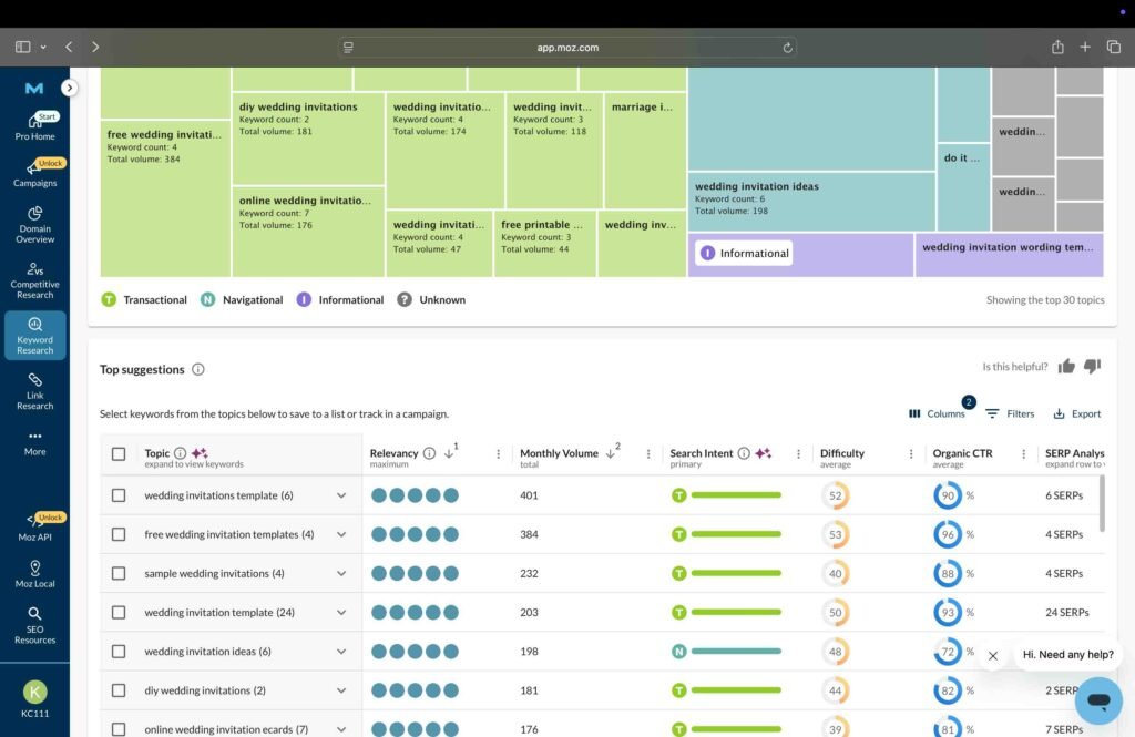 In the screenshot below, you can see that the tool provides detailed visual graphics showing keywords by search intent. Furthermore, it also provides various useful metrics for keyword ideas.
