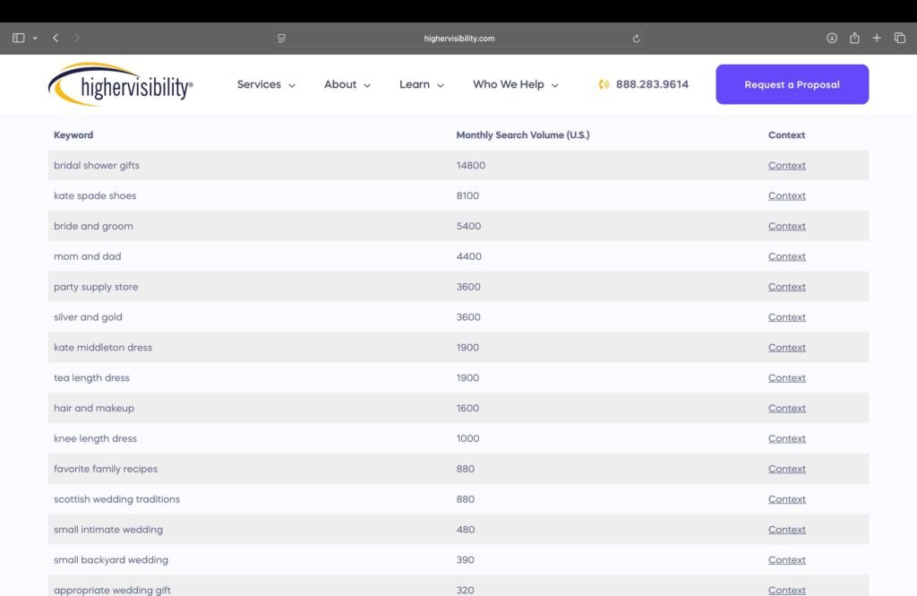 In the screenshot below, you can see the tool provided various keyword ideas, such as “bridal shower gifts,” “silver and gold,” and “small backyard wedding” for the search term “wedding.”