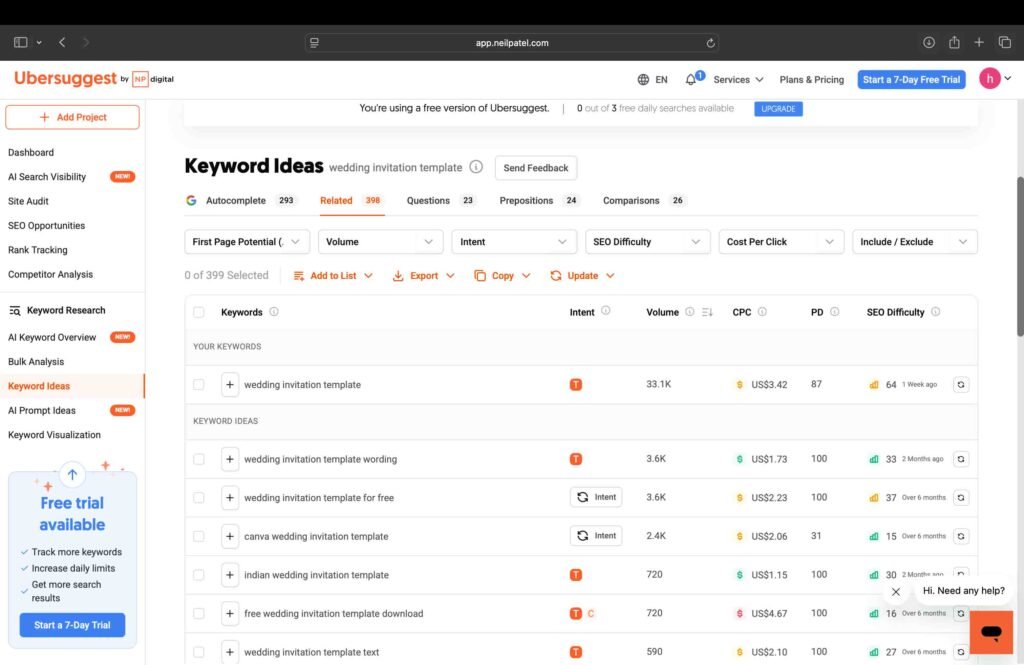 Ubersuggest Keyword Ideas Tool offers a limited free research tool that offers 3 free daily searches. The tool offers both autocomplete suggestions based on Google searches and related keyword ideas.