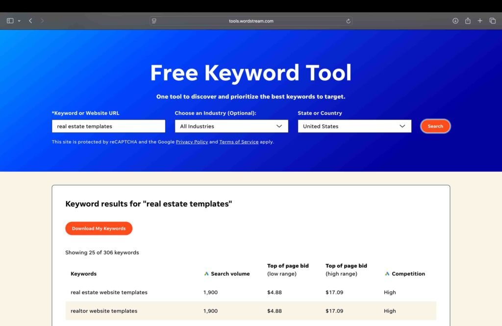 WordStream offers a completely free keyword tool. This tool also offers a sufficient number of keywords for further research. As you can see in the screenshot below, the tool generated 300+ keyword ideas for the search term “real estate templates.”