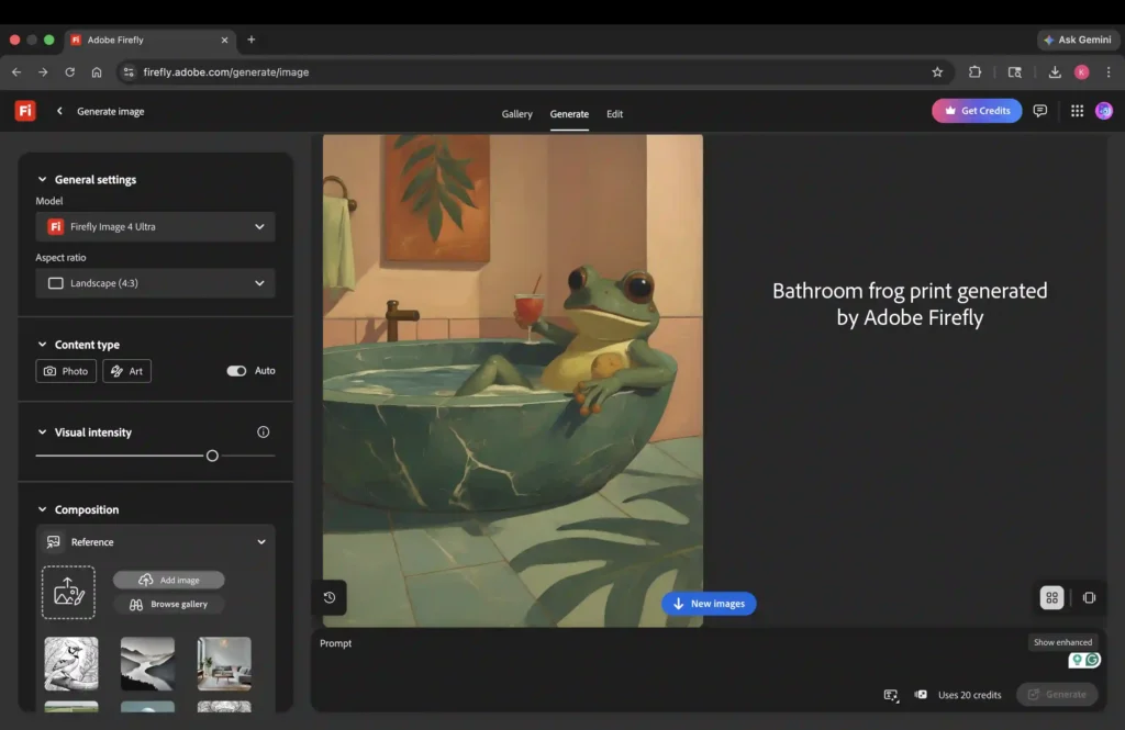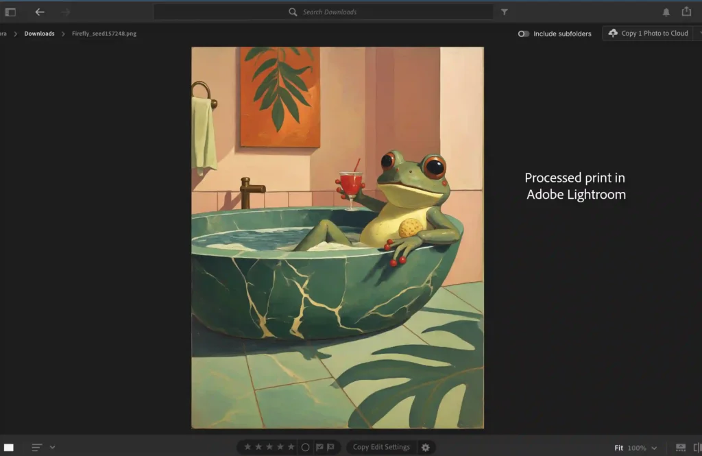 In the Adobe Firefly screenshot below, I generated a ‘bathroom frog print’ image with an original prompt that clearly described the main subjects (frog and bathtub), the frog’s actions, the bathtub’s color, material, and shape, the overall environment, and the style.