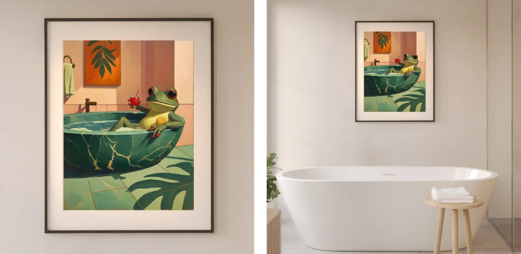 Listing photos are quite important for getting sales when it comes to wall art. After all, wall art shoppers are looking to enhance their decor. If your listing photos fail to meet aesthetic standards, shoppers will lose interest quickly. While there are third-party websites that offer premium-quality mockups, you can easily generate them on your own with an AI image generator. I have generated the bathroom wall art mockups below using Adobe Firefly.