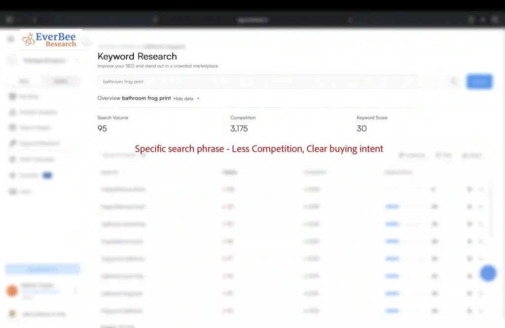 In the screenshot below, the EverBee keyword research tool shows that you can bring down the competition from 35k+ listings to only 3k+ listings by targeting specific search phrases.
