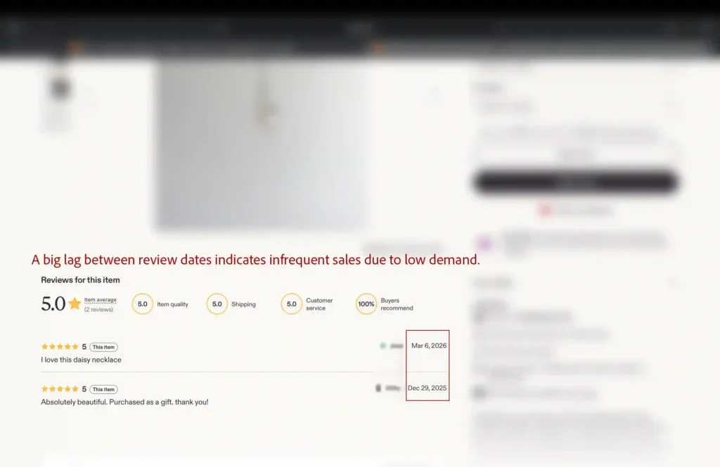 Example: Most top-selling jewelry listings on Etsy are gold-plated minimalist styles. Shops selling other styles typically experience less demand for their products. Below is a screenshot of the review section of a silver necklace listing. If you look at the lag between review dates, you will notice that sales did occur, but infrequently. This is because it deviates from the popular gold-plated style.