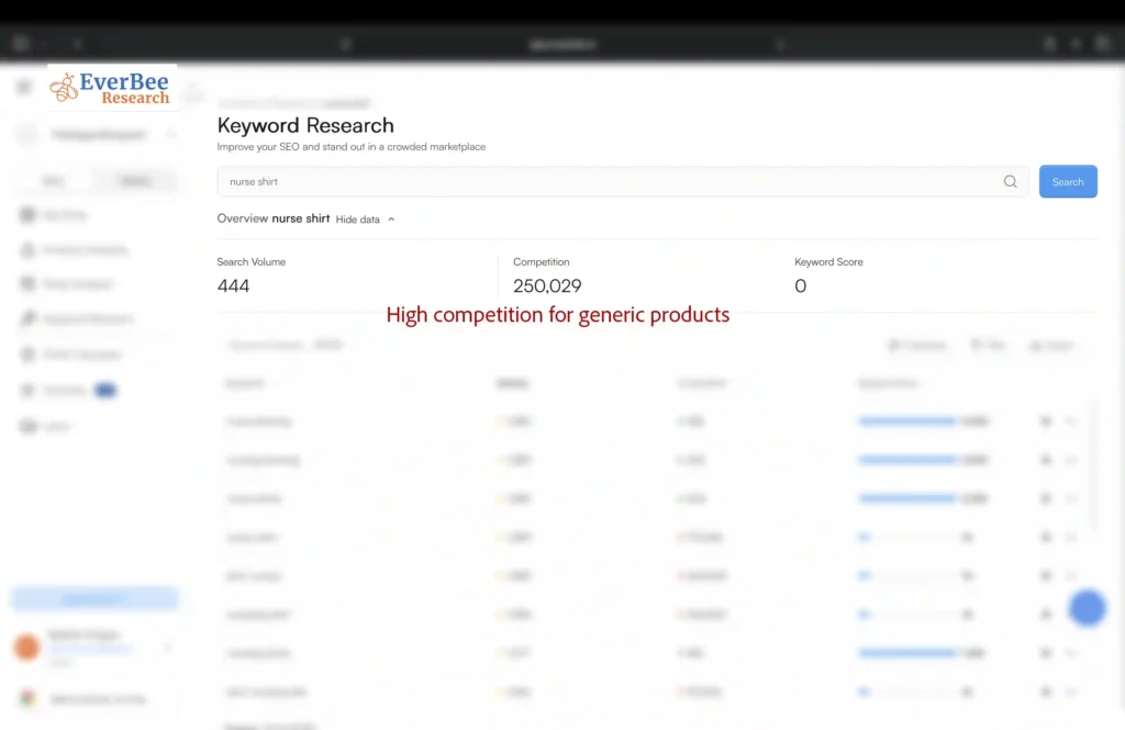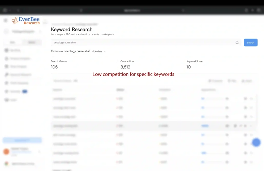 You can use the Etsy research tool EverBee to find specific products with less competition. You should further validate their demand by checking sales in EverBee and the listing’s review section on Etsy itself. In the EverBee screenshots below, you can see how you can bring down the competition with specific products within the ‘nurse shirts’ niche.