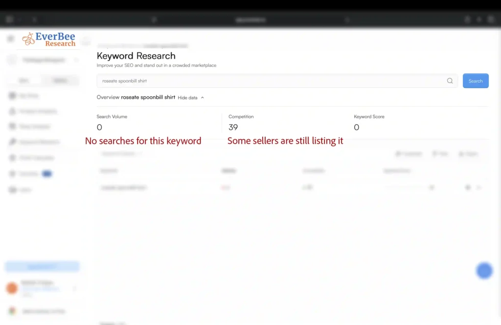 Example: There are many ‘roseate spoonbill’ T-shirts on Etsy. You might be a bird lover and know about this bird, but nobody is searching for this T-shirt, as shown in the EverBee screenshot below